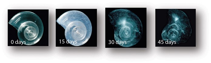 Örneğin pteropod (deniz kelebeği) canlısı kabuklu bir deniz hayvanıdır ve somon balıklarından balinalara kadar çoğu hayvanın besin kaynağıdır. Pteropodu 2100 yılı için tahmin edilen asiditede bir suyun içine koyduğumuzda kabuğu 45 gün içinde çözünür ve yaşamaya devam edemez.